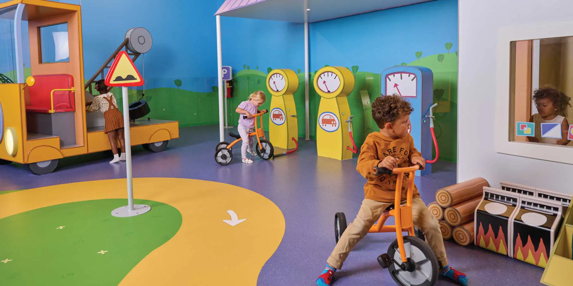Ride trikes, fill up at the gas station, and check the air pressure in your tires all at Grandad Dog's Garage.